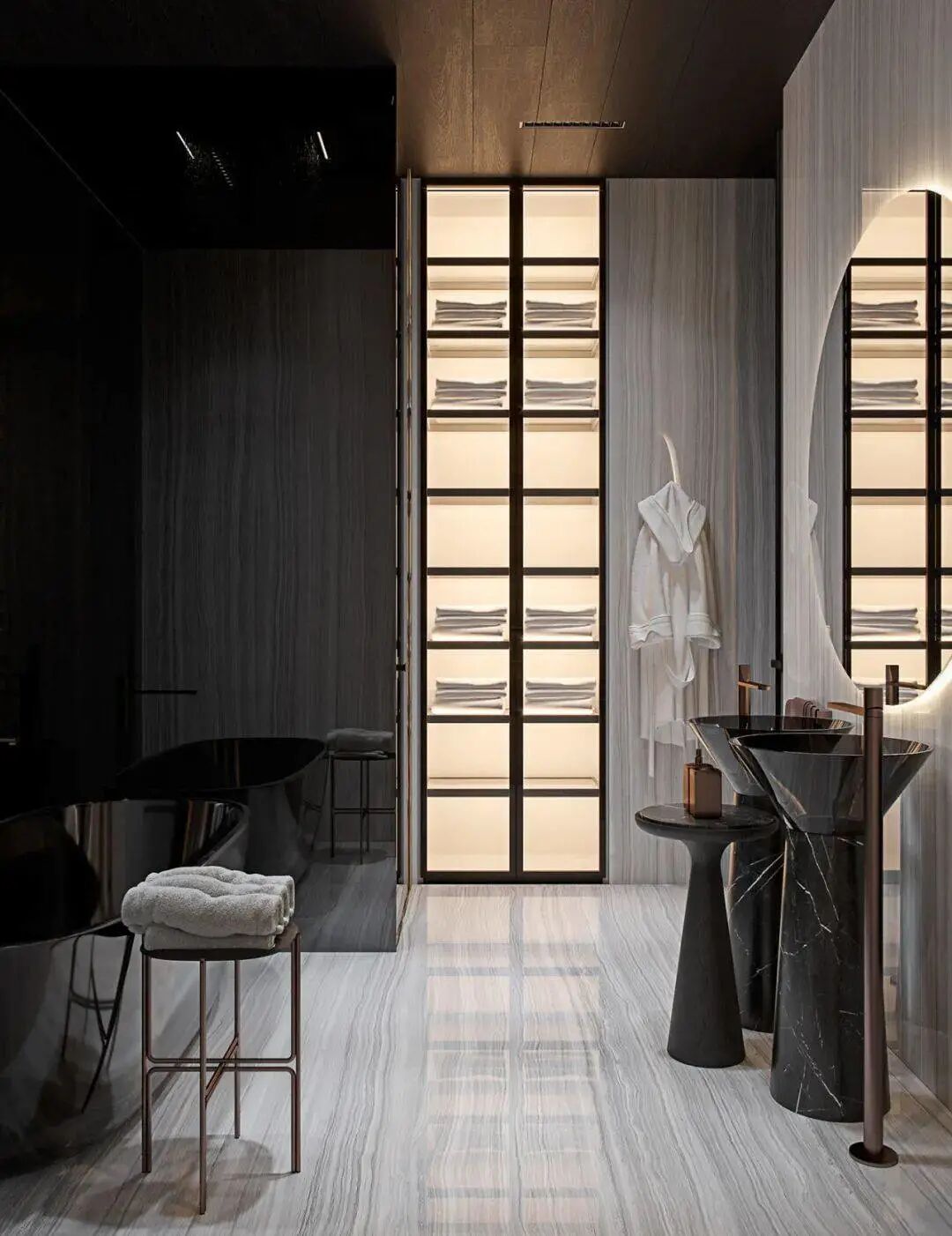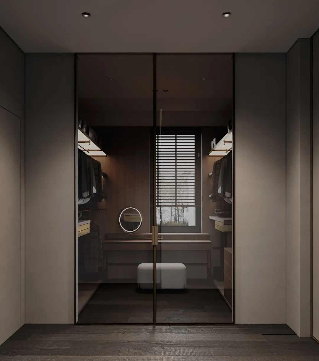 极简组合模块下,牵引出一个具质感的衣帽间,全木饰面的铺设,自带温润,饱含着舒适,从收纳到展示,再到梳妆台的设计,造型利落,把控着细腻的空间视觉,带来舒适惬意的放松时刻。