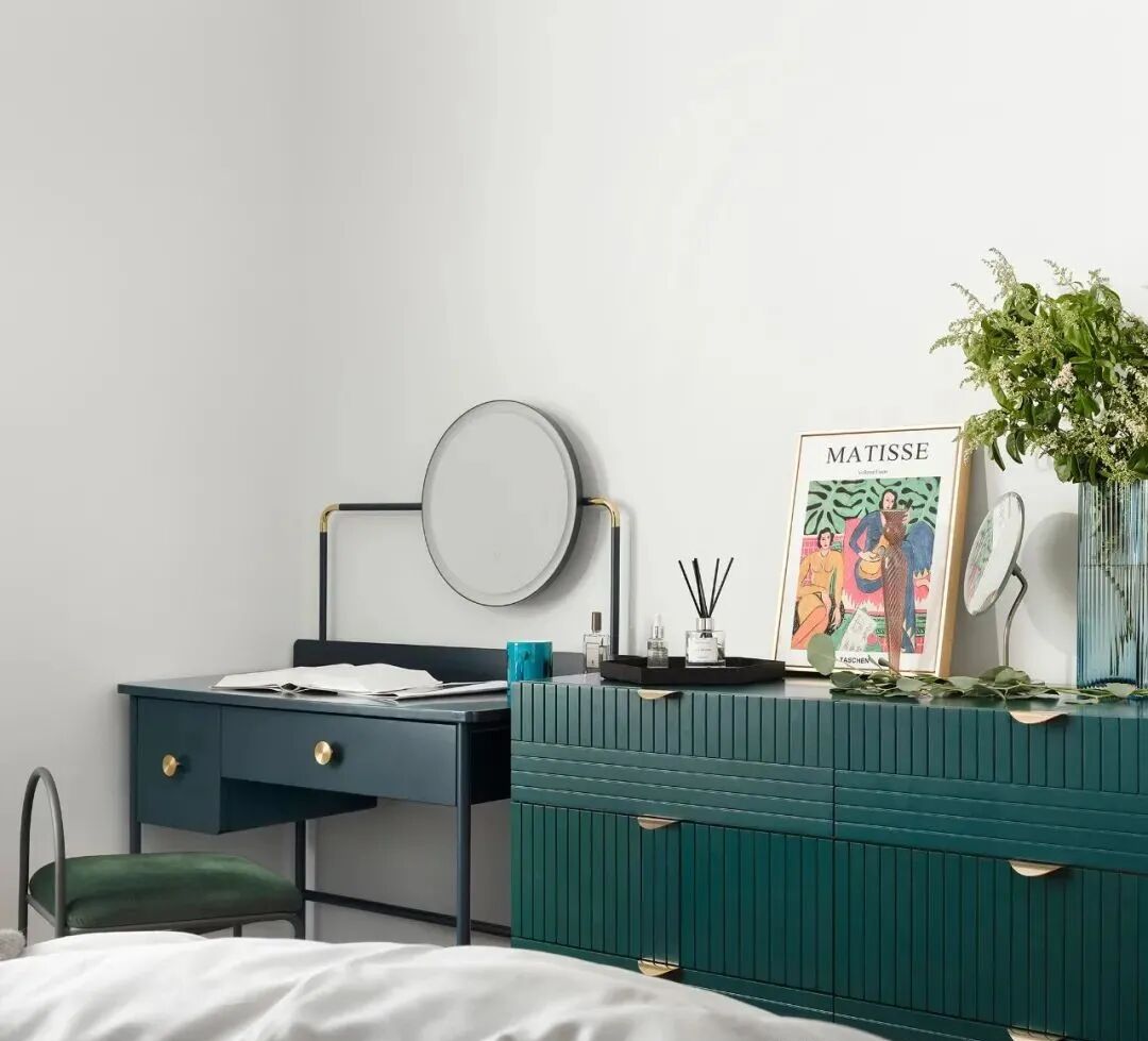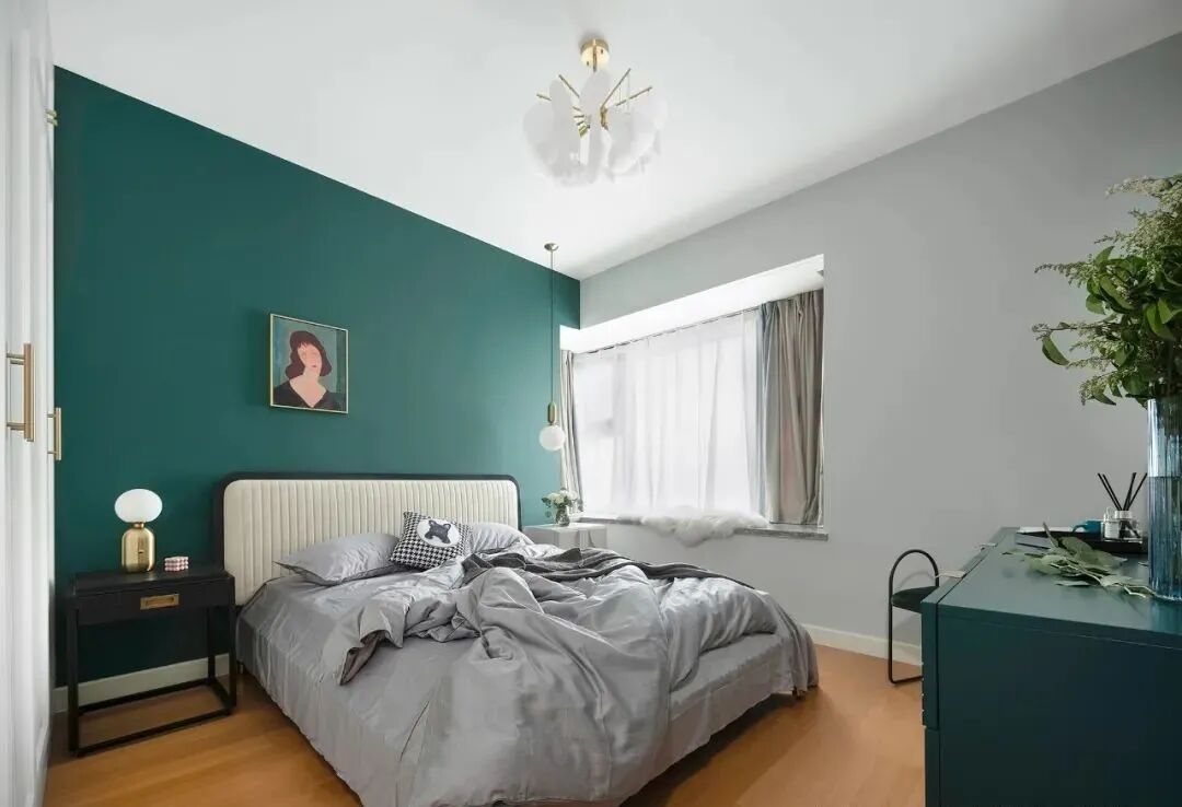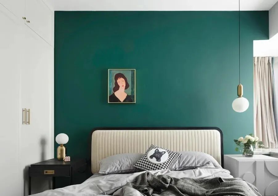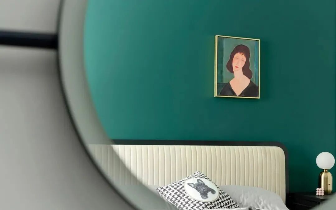 ▲ 主卧背景墙整面刷墨绿色乳胶漆,点缀一幅阿梅代奥·莫迪利亚尼的金色边框人物肖像画,画的背景同样也是蓝绿色,搭配在一起很和谐