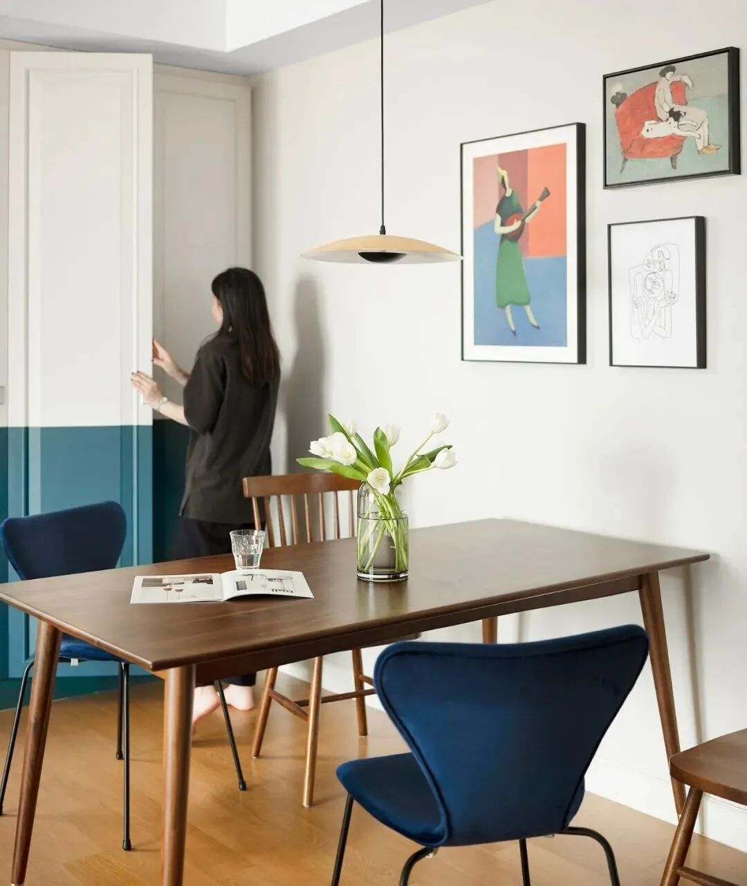 ▲ 客餐厅以过道自然分隔,餐厅原有装饰柜的白色柜门也同样做了分色处理,和客厅视觉统一