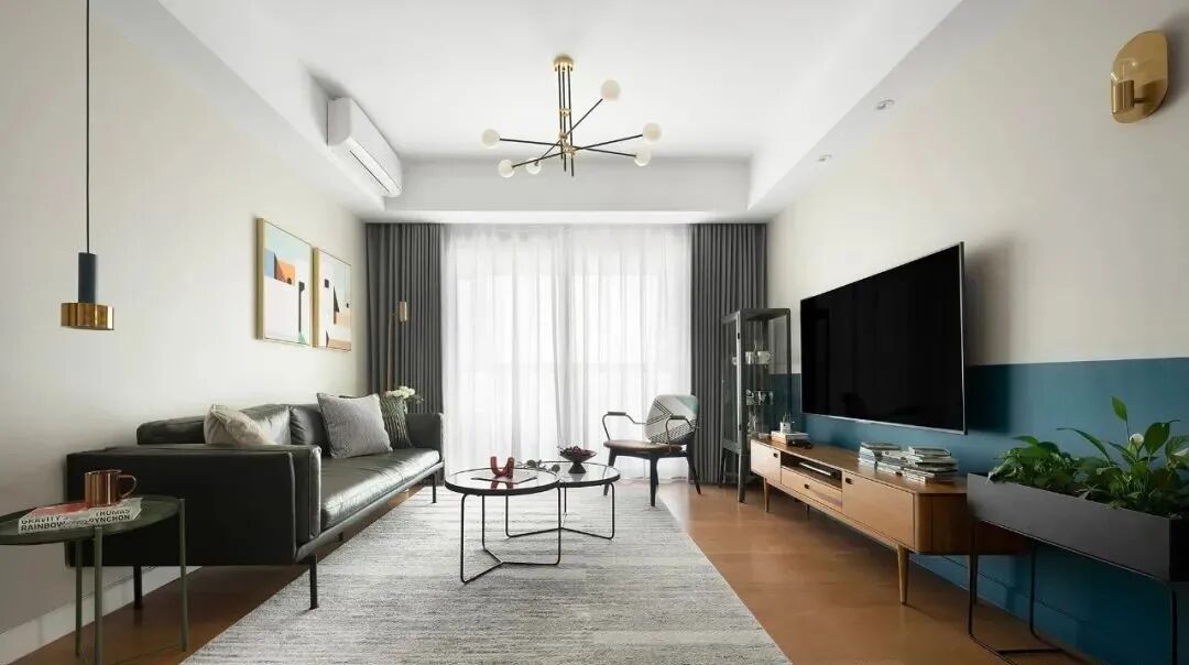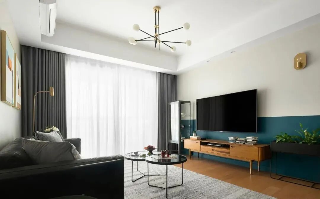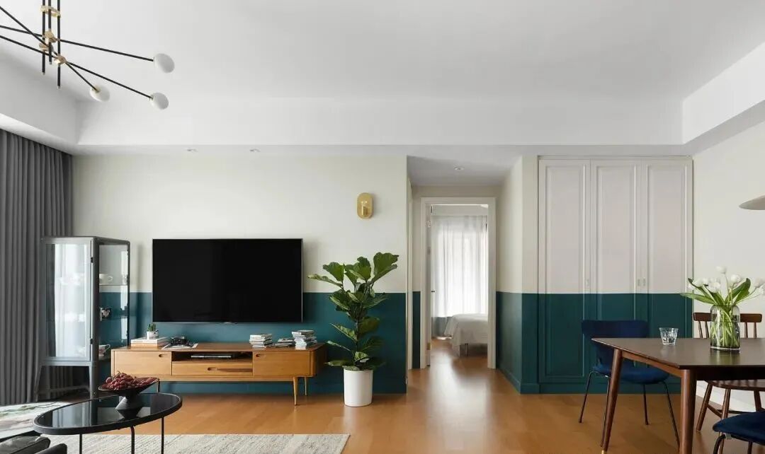 ▲ 电视墙做分色处理,浅米色+蓝绿色的上下搭配,多了一分复古小清新质感
