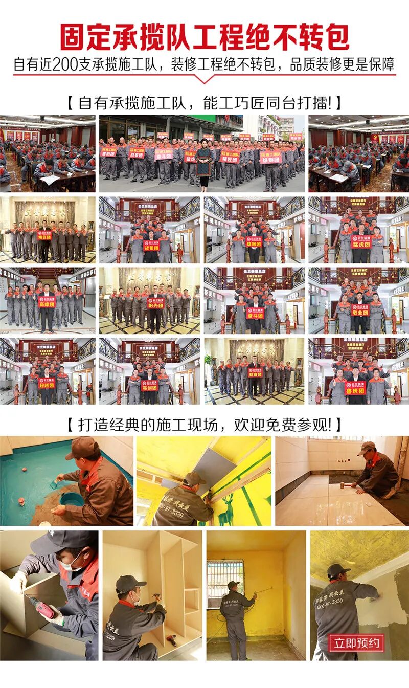 装潢公司把装修工程转包发包给社会上的包工头是痛苦装修的祸根,前面说的花好稻好都是空话!忠极装饰公司自有近200支固定承揽施工队,不把客户装修工程甩卖给施工队,这是品质装修的前提更是保障。