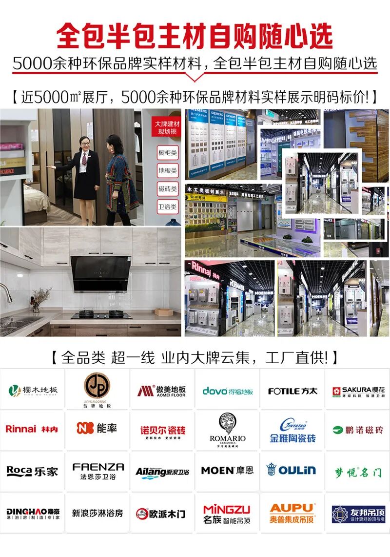 所有展示材料均标明了品牌名称、规格、型号、价格,并且把品质好、时尚新颖、维修率低、绿色环保的材料挑选出来,向客户展示推荐,并自行挑选,客户选着也省心,用了更放心。