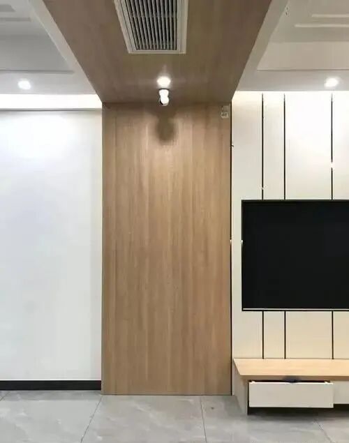 在大面积的木饰面上,混入一面隐形门,这样可以起到非常巧妙的隐形门设计效果。