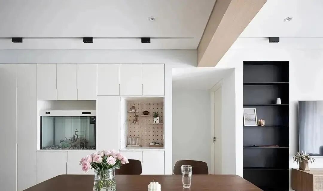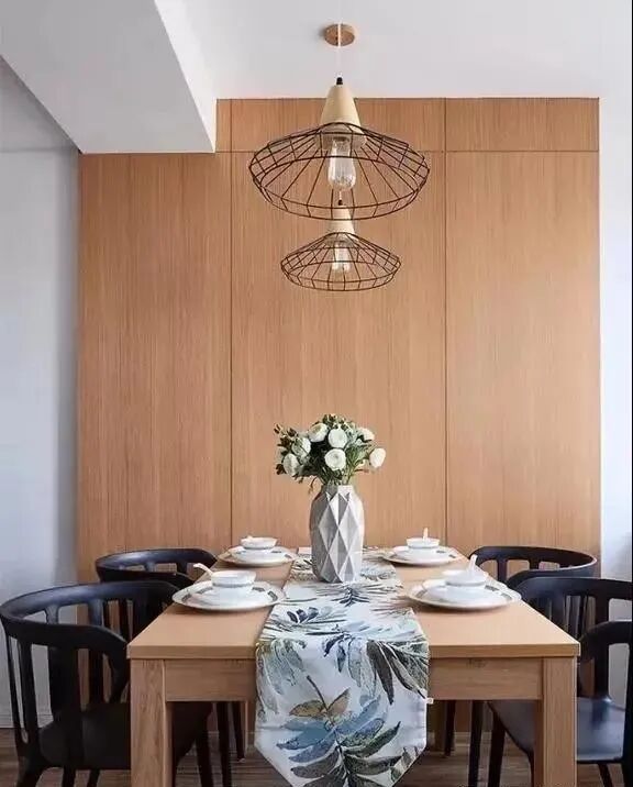 餐厅是家人用餐的空间,可在餐厅背景墙或厨房开门的那面墙,也可以引入木饰面的质感,与柜子结合方便细节收口,又能提升空间的高级仪式感。