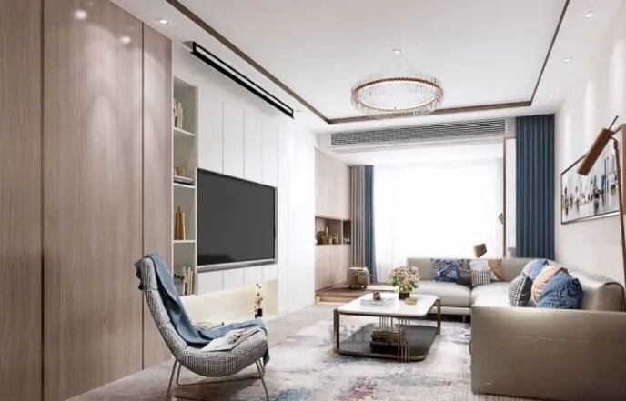 在空间中间有衡量的情况,如果不做处理的话视觉效果就会比较压抑,那就可以把旁边的柜子或墙面延伸到天花,用木饰面把横梁装饰起来,让横梁显得更加和谐美观。