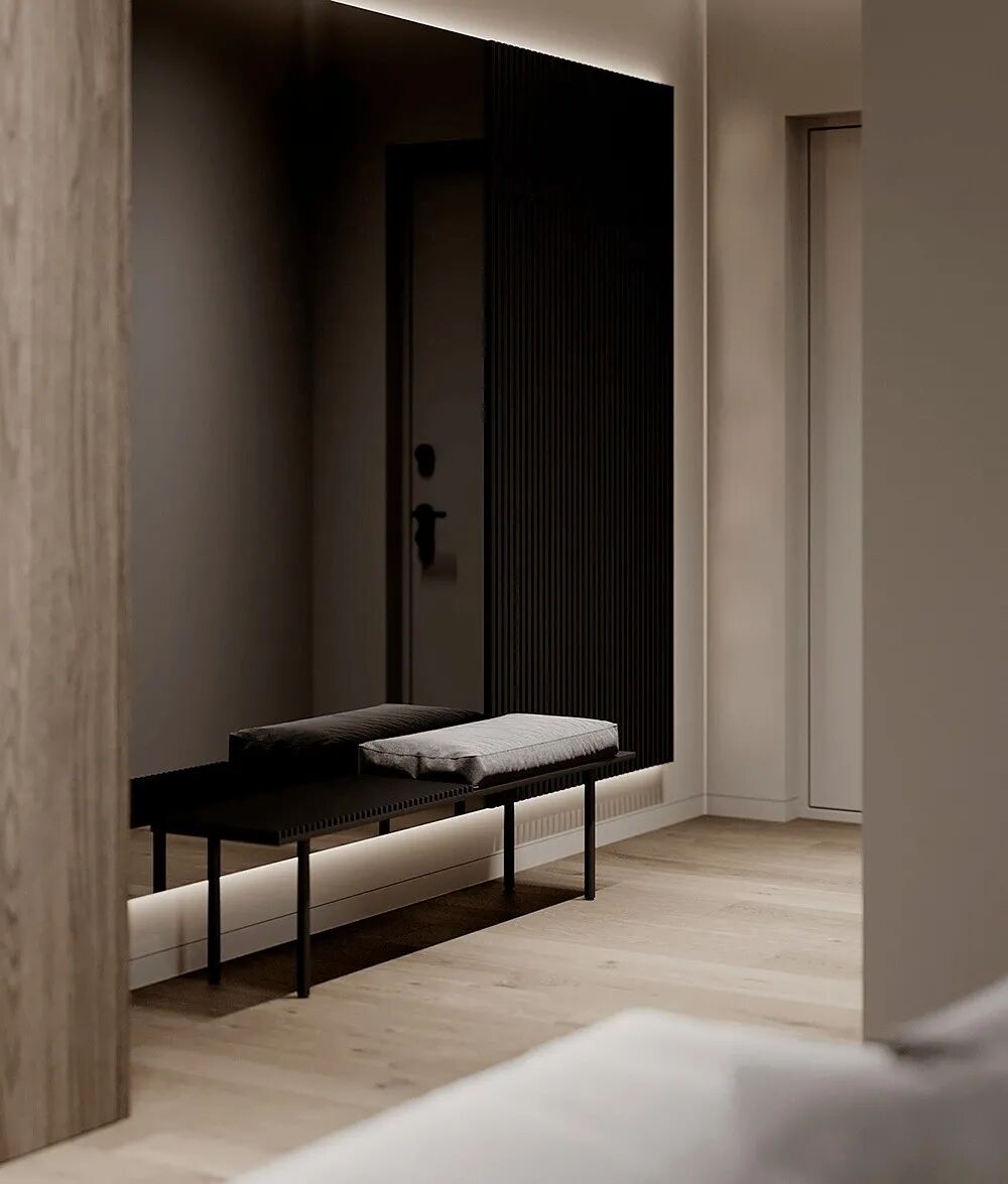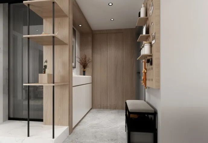 玄关是回家后进入的第一个空间,而在满足基本实用功能的基础,在墙面上加入木饰面的话,那么回家后的第一空间感就显得更加高级温馨了。