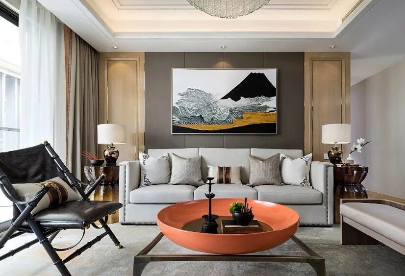 ▲对称的木饰面造型,也让沙发墙更加档次有趣。