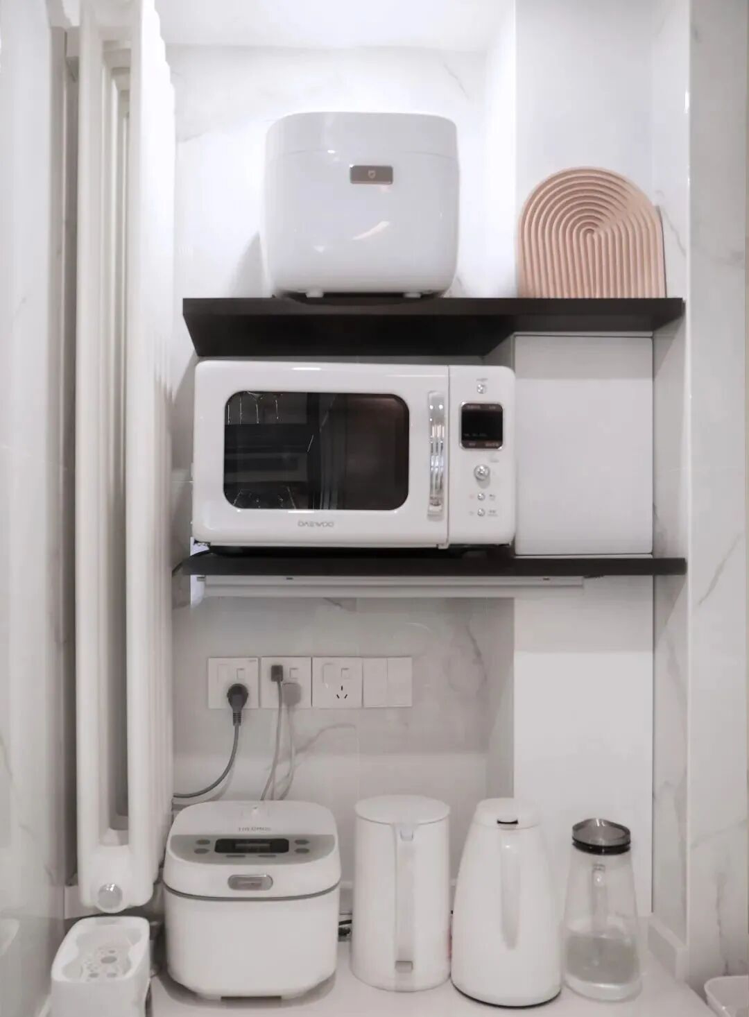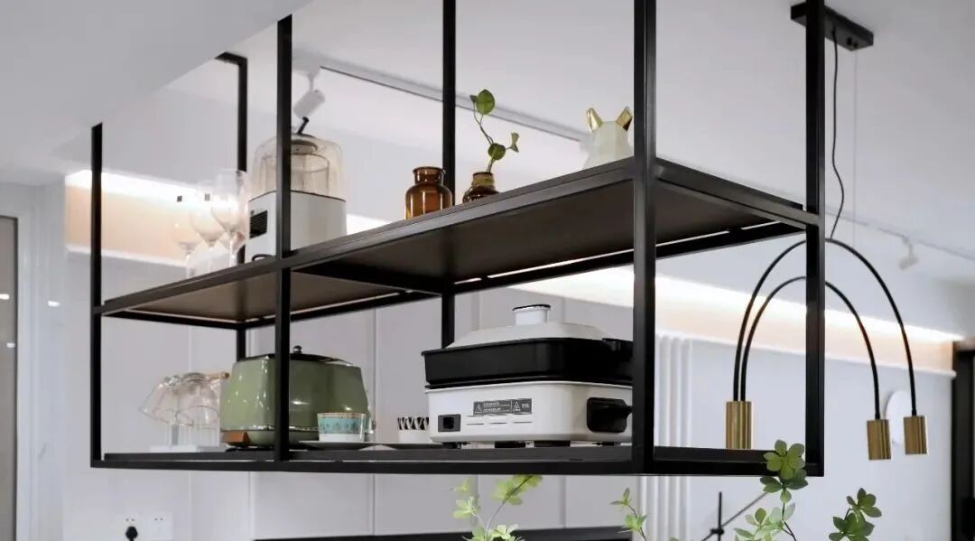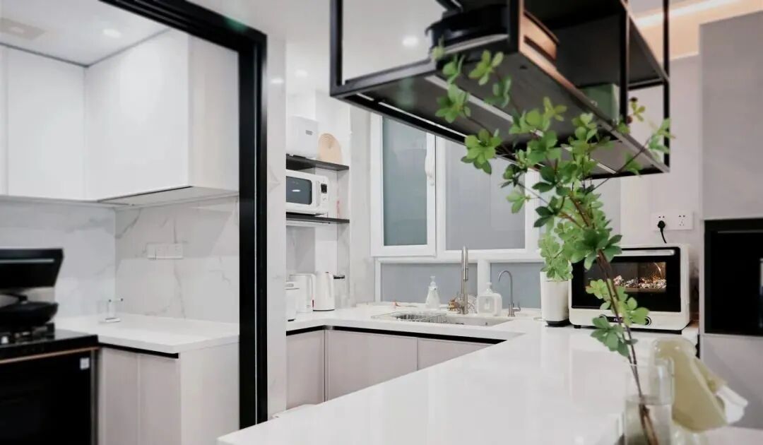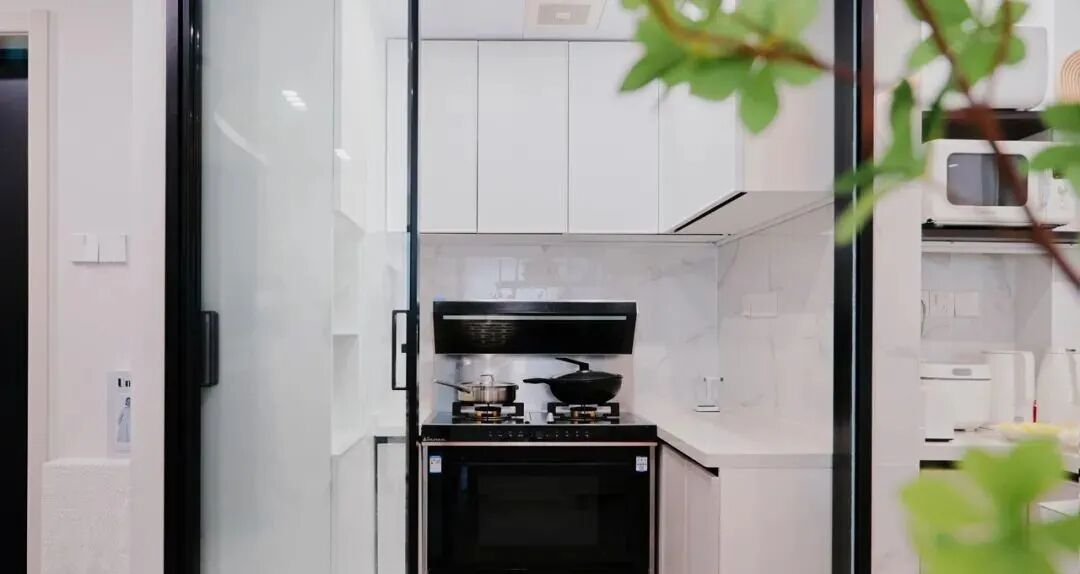 2、推倒原始厨房所有非承重墙体,使得整个入户与厨房空间连通开放,重新布局玄关、中西厨位置与关系,在“可封闭中厨”与“开放式西厨”之间取得平衡。