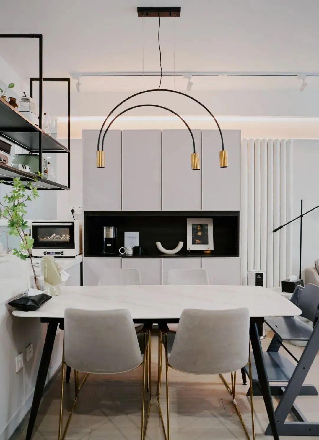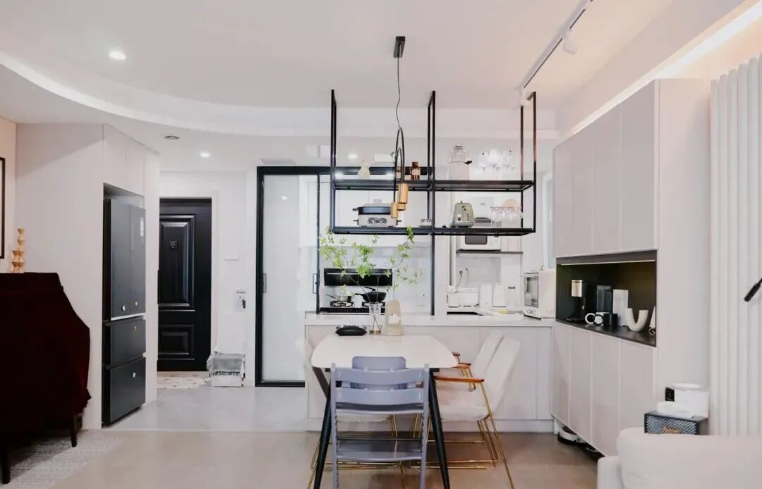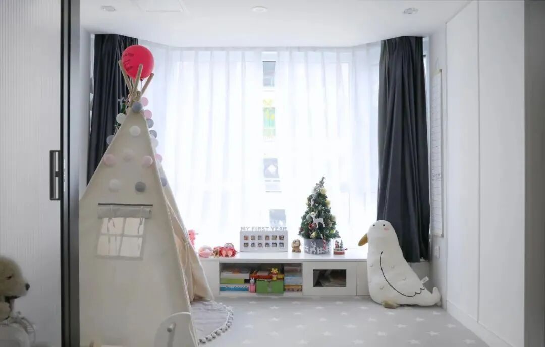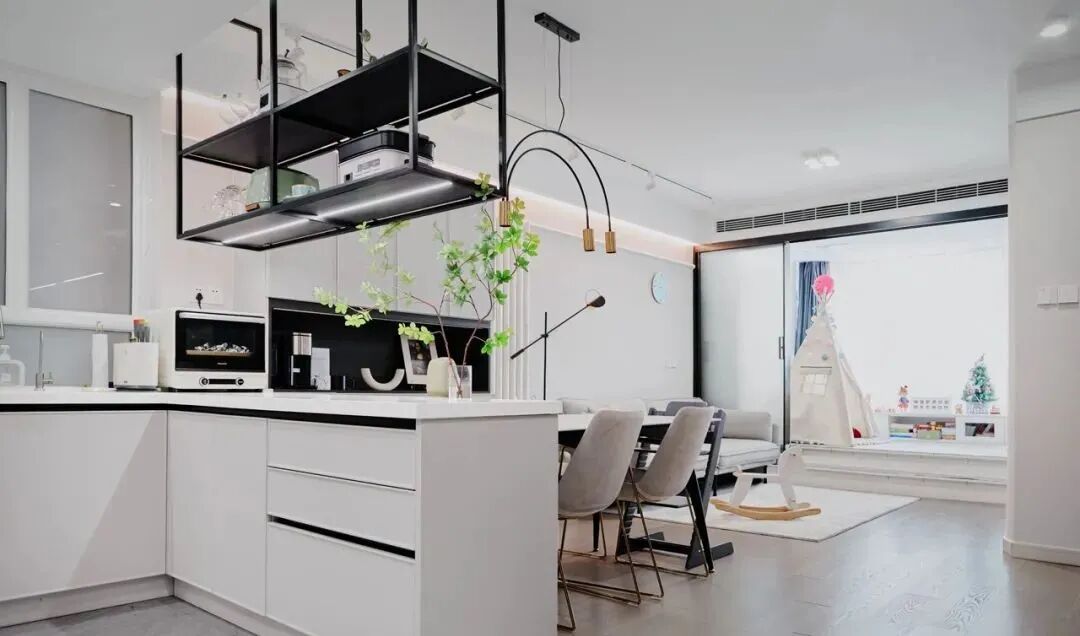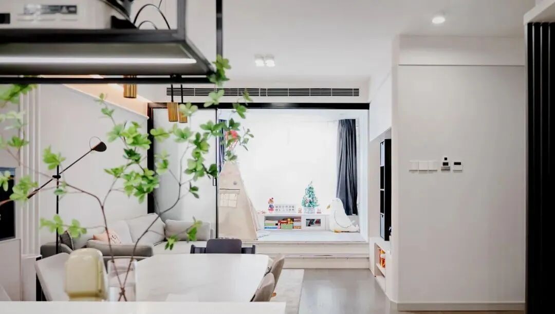 3、餐厨一体化的设计将客厅重心北移,靠窗区域利用四轨吊装长虹玻璃门隔出一个5㎡左右的地台空间,成为孩子的游乐区。