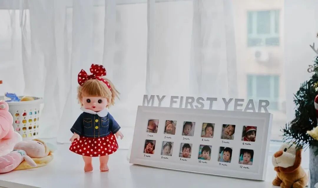 靠窗的定制柜,台面摆的玩偶和孩子的成长照片,十分可爱。