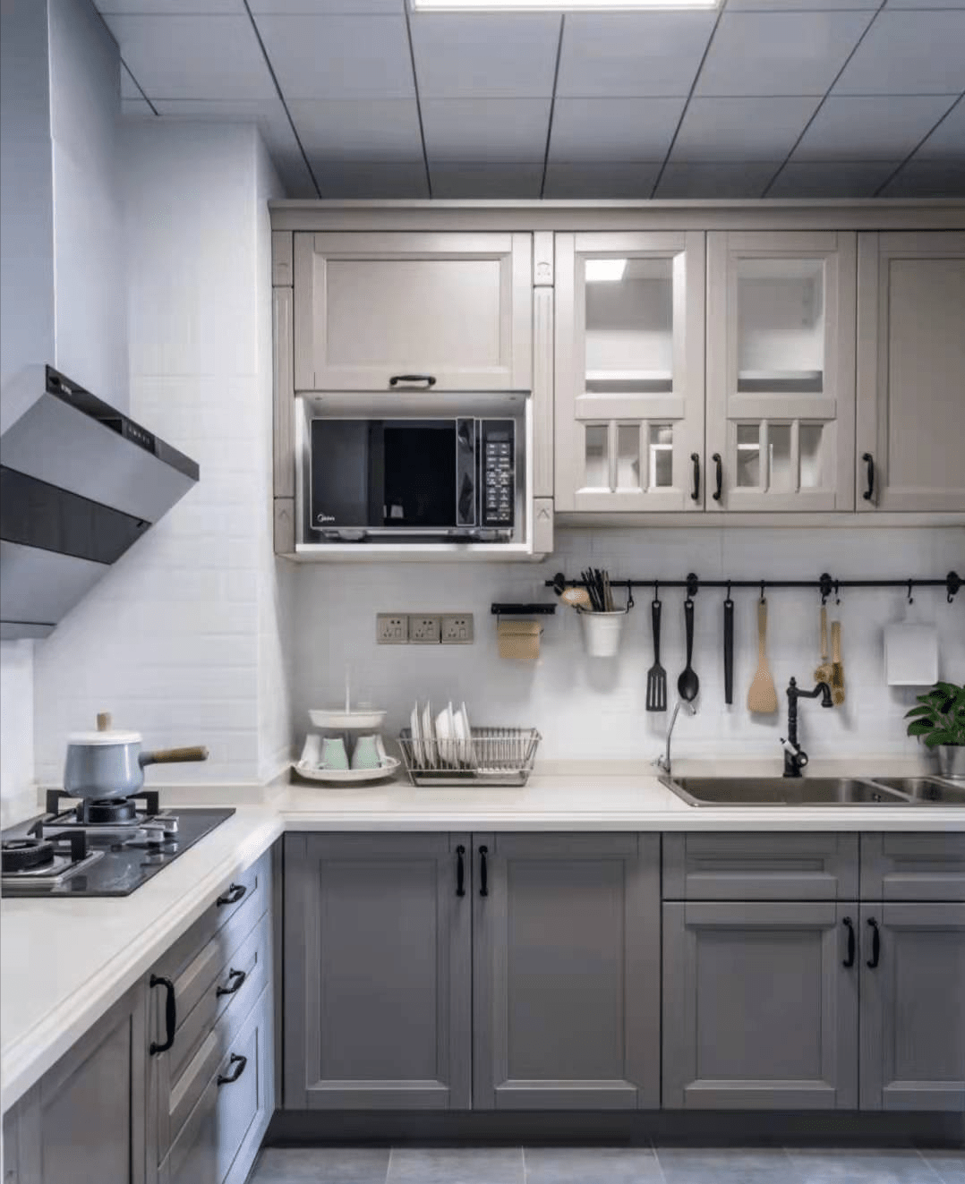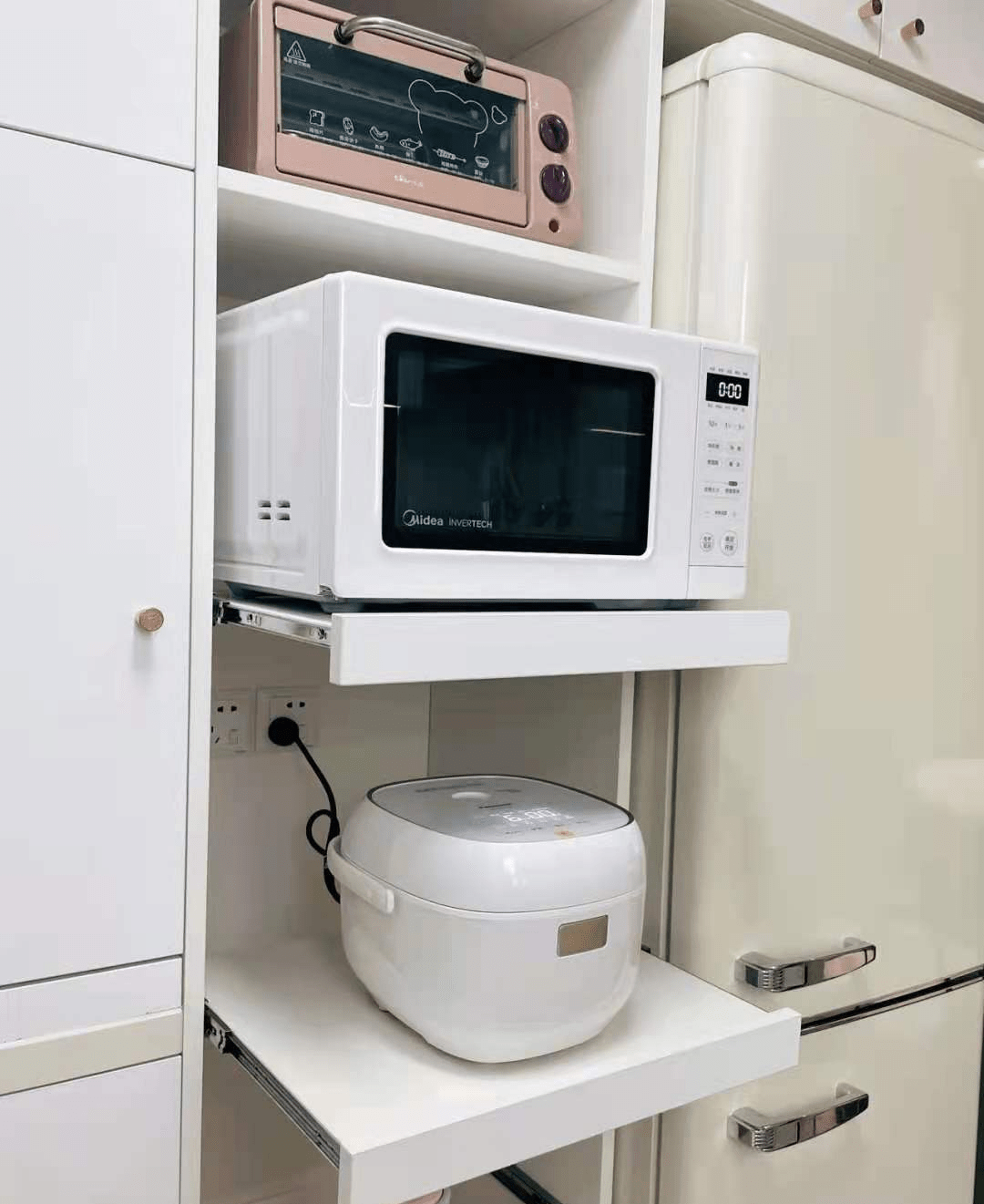 在这里建议:在厨房做一个可抽拉的电器柜来放微波炉,这样实用+美观又实用。
