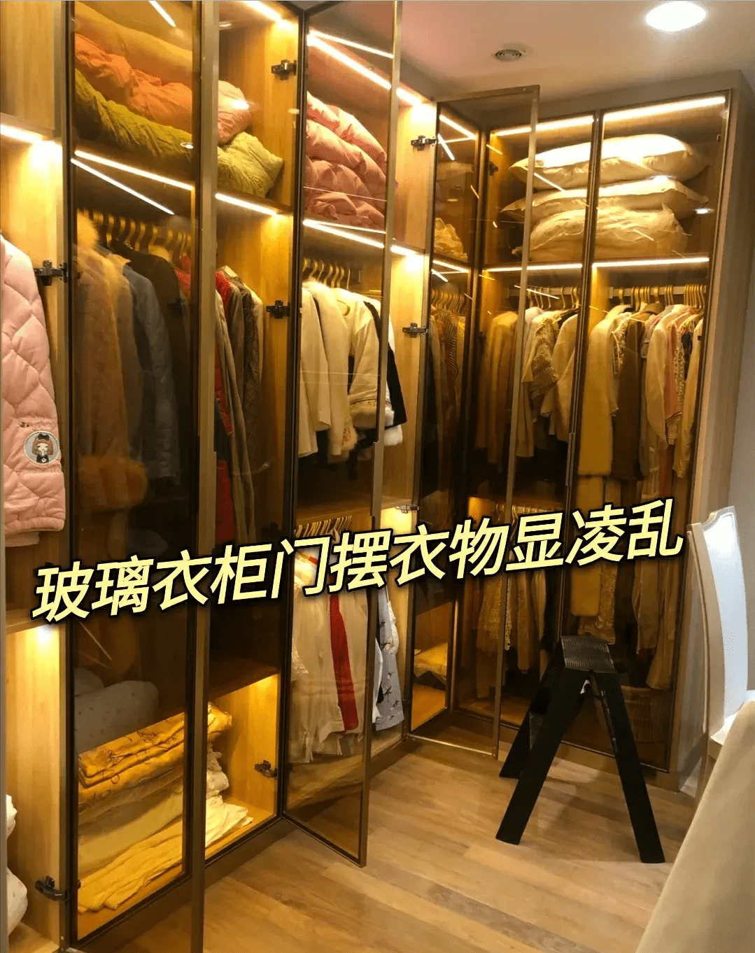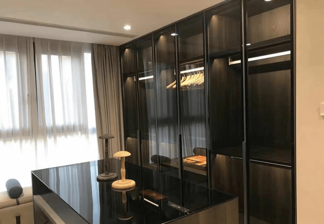 现在衣柜的柜门流行做平开式,而且还是带玻璃的。这类橱门一眼就能看到衣柜里的衣服,方便拿衣服,特别是配上灯光后,不仅有颜值,有氛围,还显得很高级。