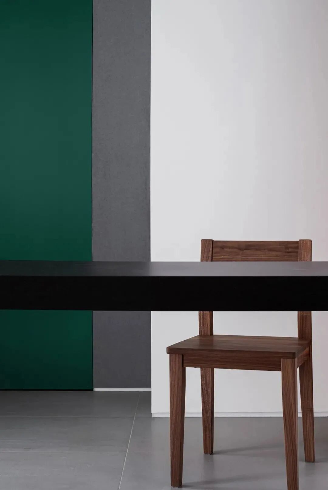 ▲ 选择两组对比色做公领域的主色彩,留白背景点缀绿植,黑色从地面延伸至隔断