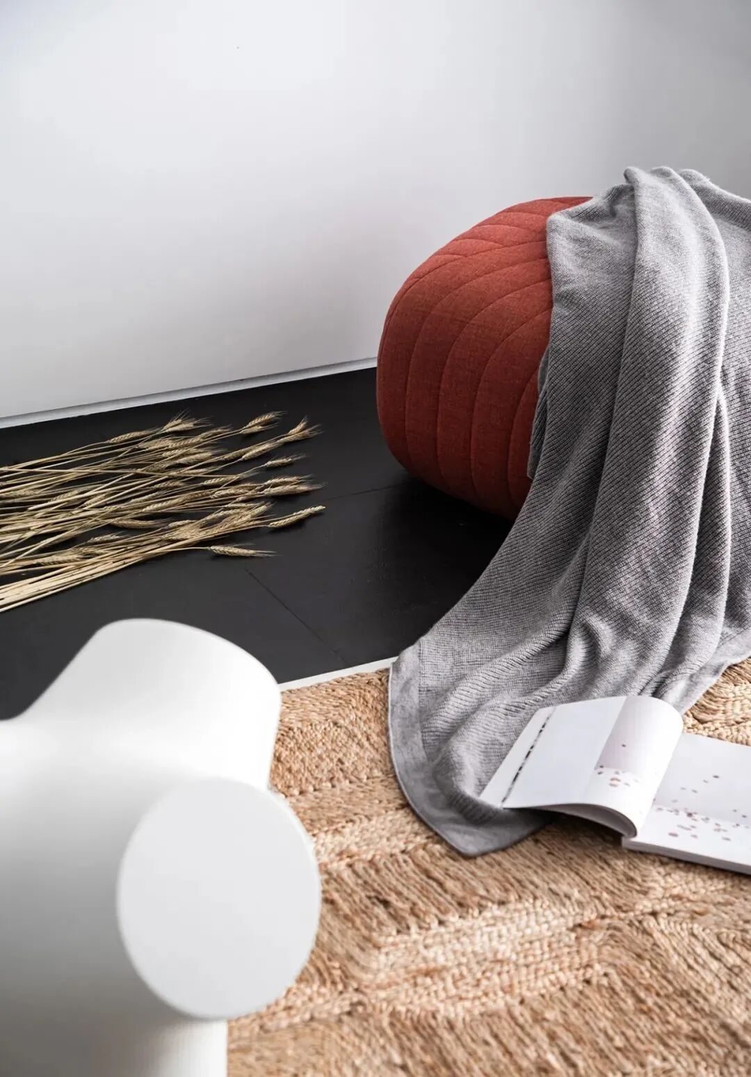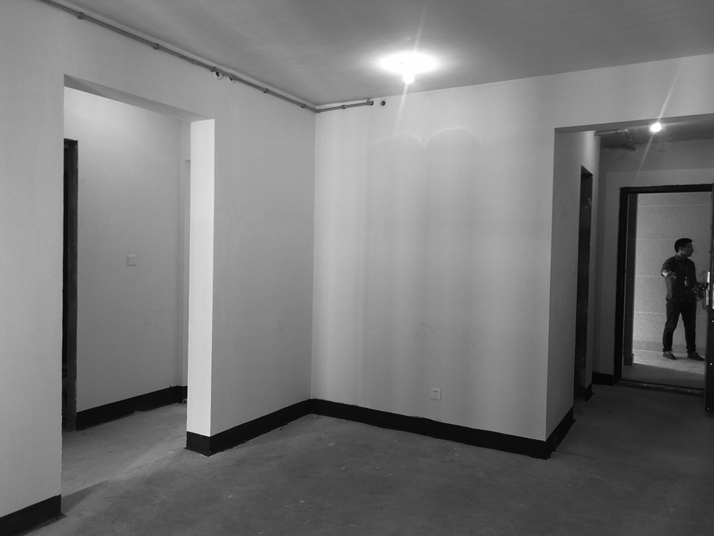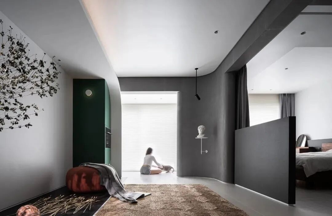 ▲ 将所有非承重隔墙拆除之后,小空间用最极简的方式处理现有空间分隔,客厅取消传统沙发,席地而坐艺术场域拥有了开敞明亮的活动空间