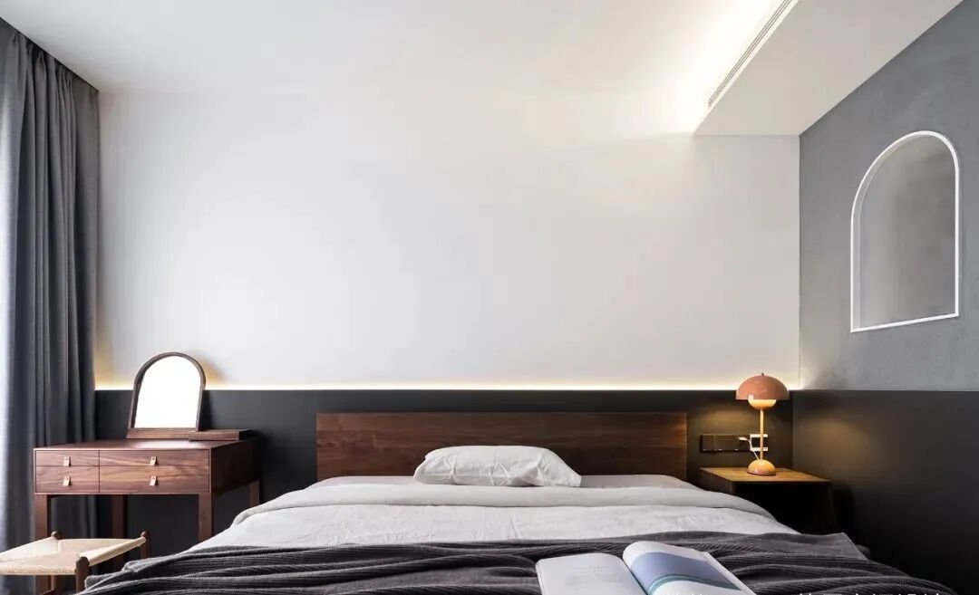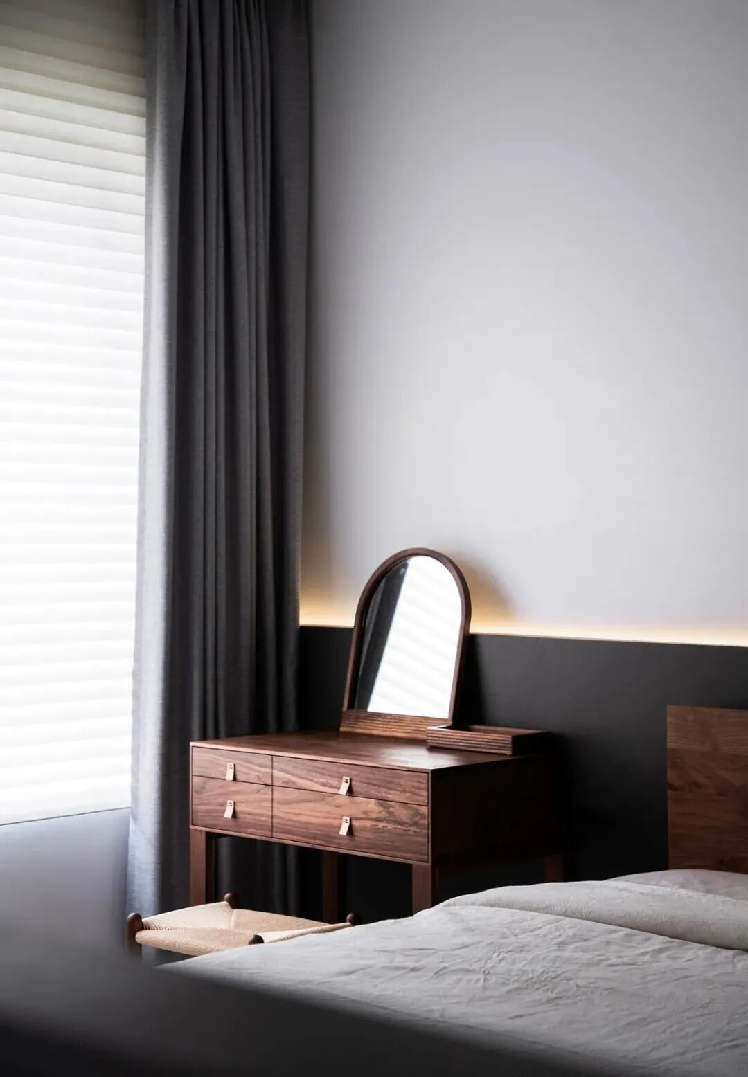 ▲ 主卧,整个空间以黑白灰为基调,搭配深色的原木家具和素雅的床品,床头氛围灯联系着化妆镜和浴室窗的拱形元素