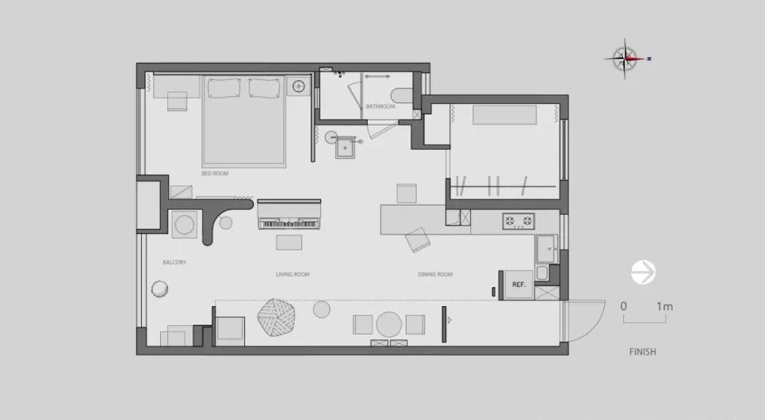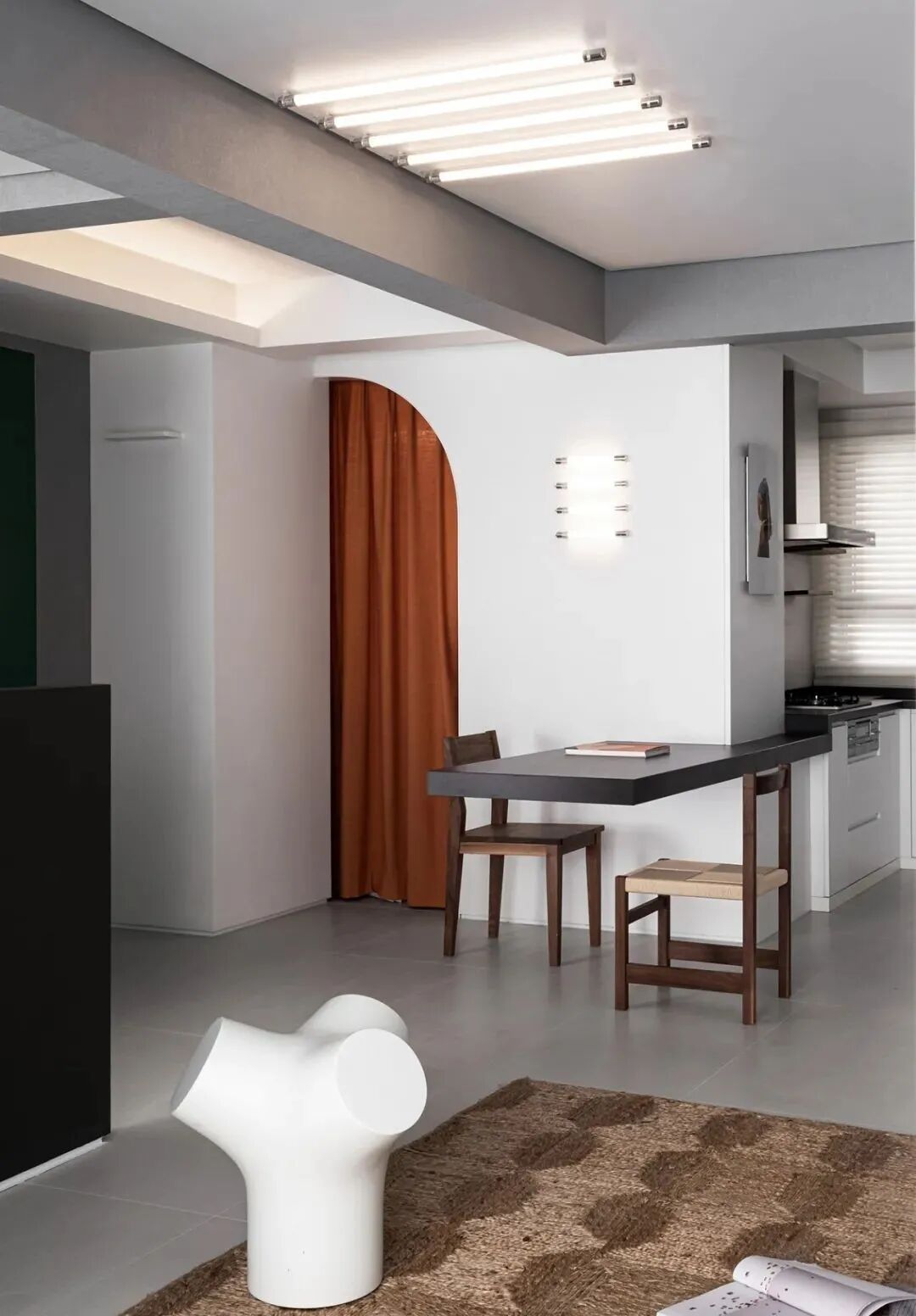 ▲ 客厅与餐厨LDK一体化的设计,大大解放小户型的空间感,顶面白色顶面搭配裸露的灰色梁,在灯管照明的加持下,增加轻工业风的格调