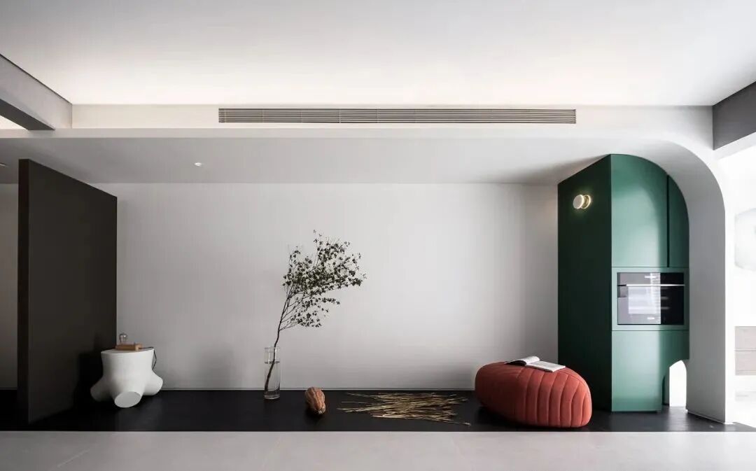 ▲ 绿色置顶柜体,在墙顶的弧线处理与在落地处留让猫咪空间的线条保持呼应,阳台纳入客厅增加使用面积与采光,保留生活功能