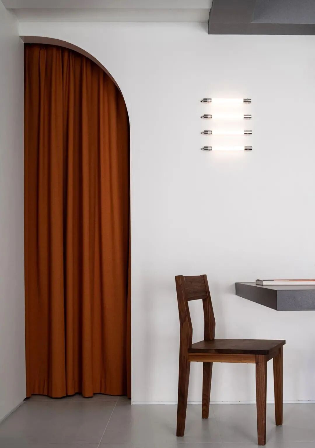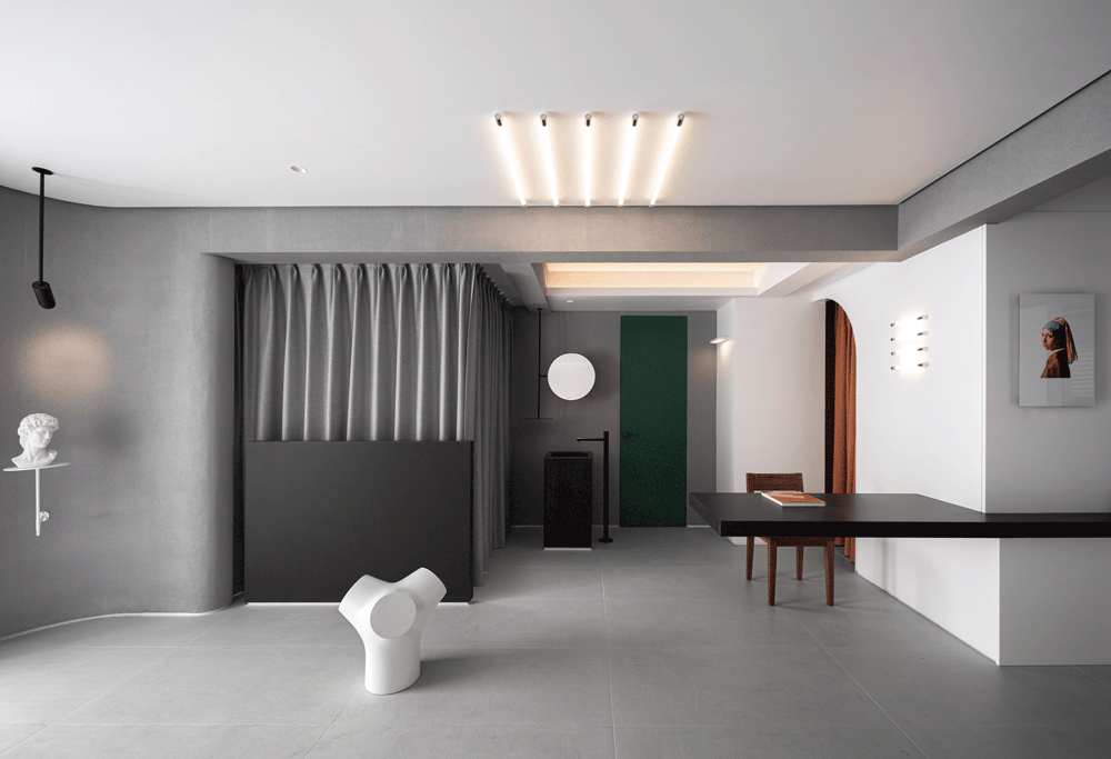 ▲ 空间中的矮墙、帘子、桌面、柜体赋予空间戏剧化的特质,以美术馆中陈列的艺术品为设计灵感,线条、灯光、色彩构成一个个艺术品的元素,给人一种居住在美术馆的生活体验