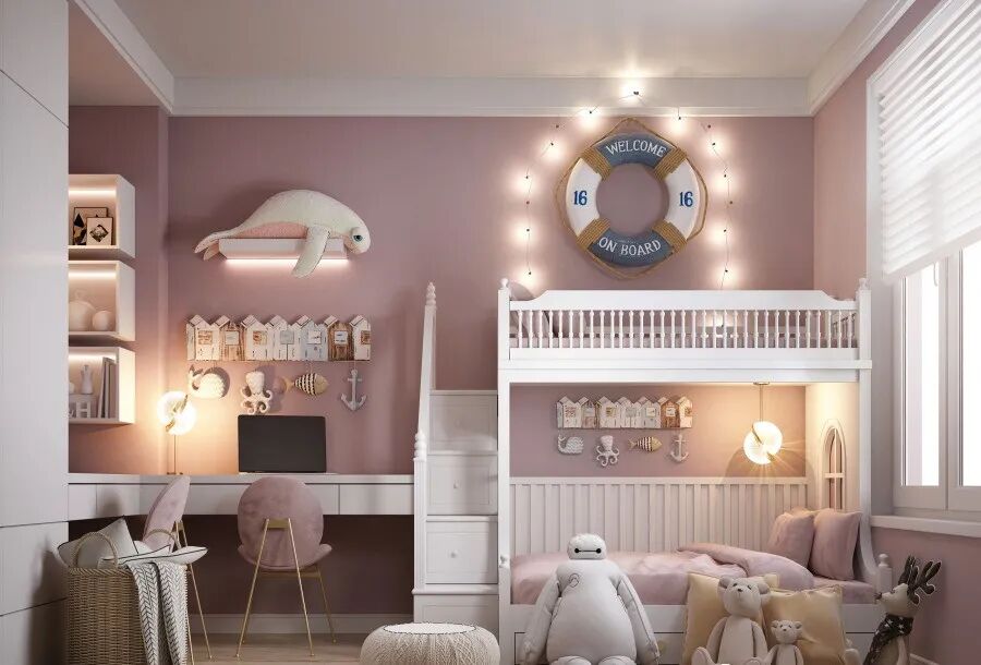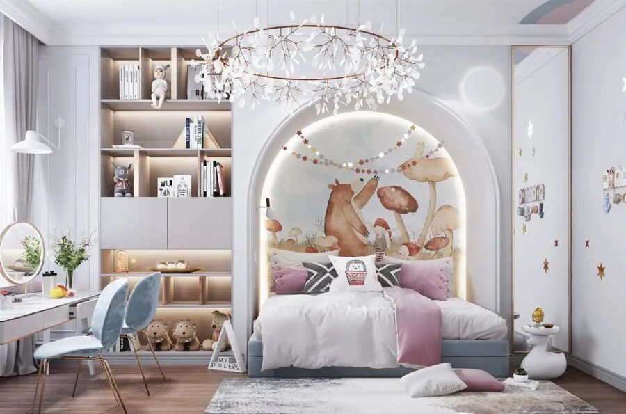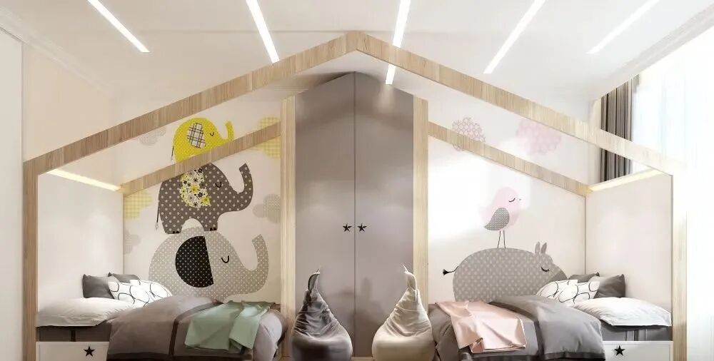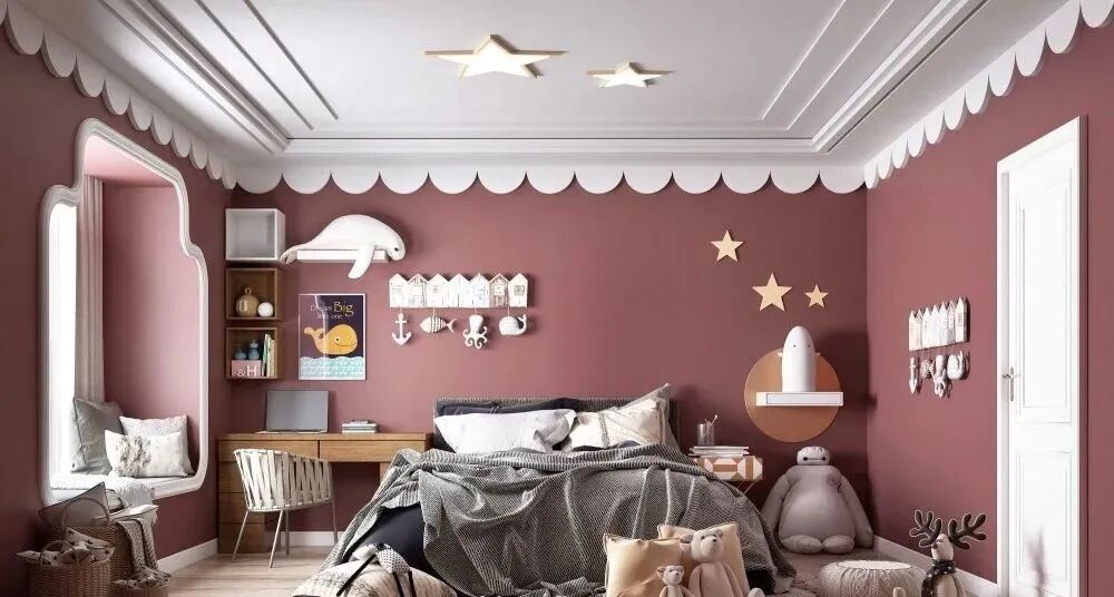儿童成长时他的想象力是非常丰富的,我们装修时不宜使用白白的墙面,虽然看起来非常的干净整洁,可在孩子们眼中就缺少了一些什么,我们可以选择一些童话卡通的色彩,让孩子的成长有着臆想。