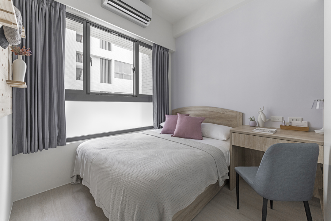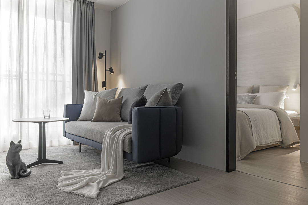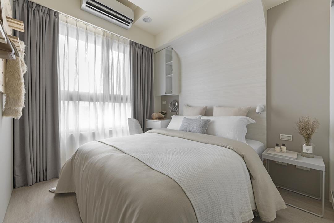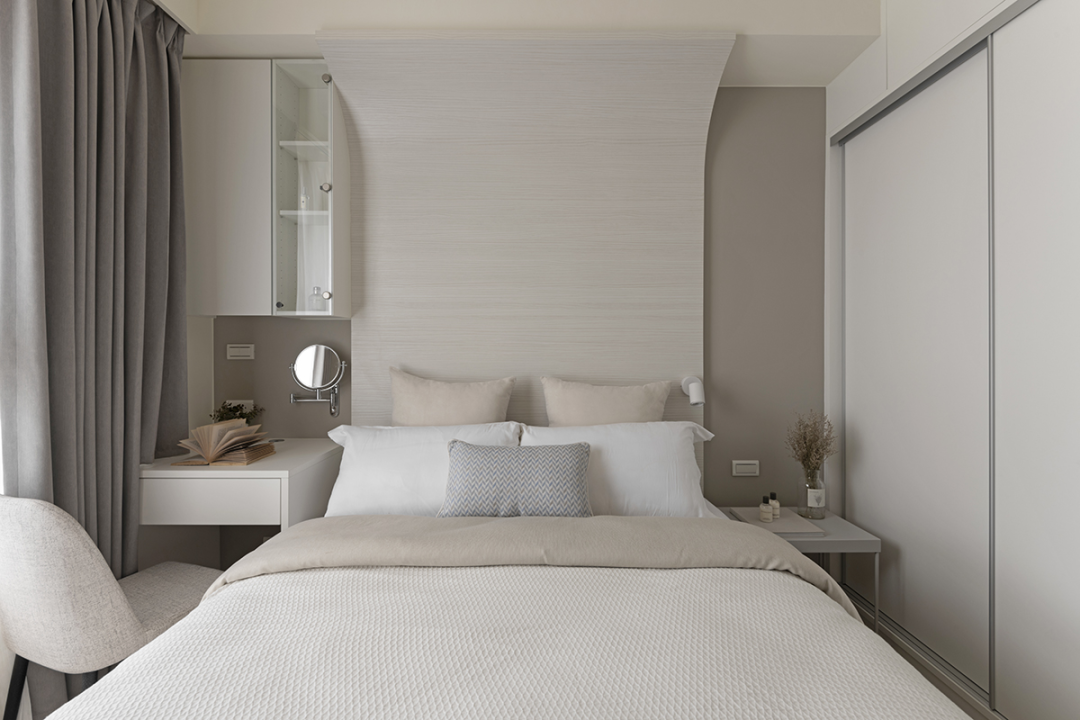 木纹饰面垂直堆叠,轻柔地以一道流弧曲面收拢天花梁深,既无占据任何床尾过道空间,更巧妙化解床头梁压的风水疑虑,简约又大气的卧房主景。