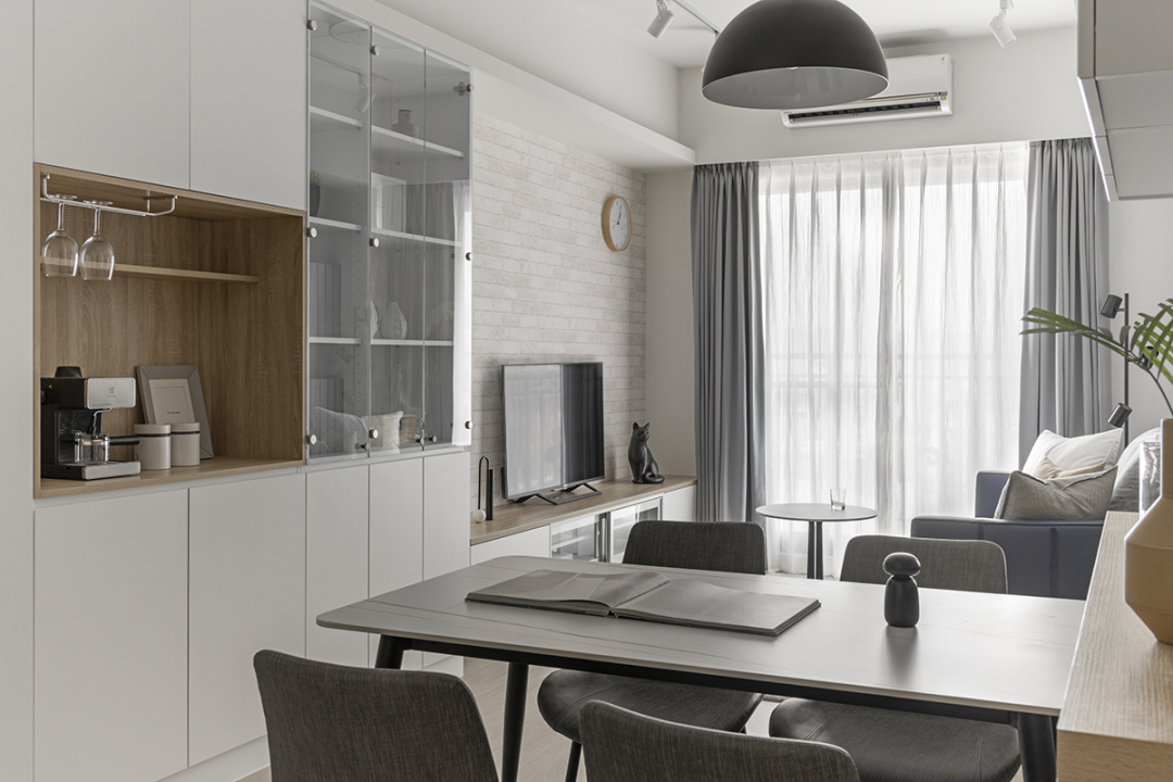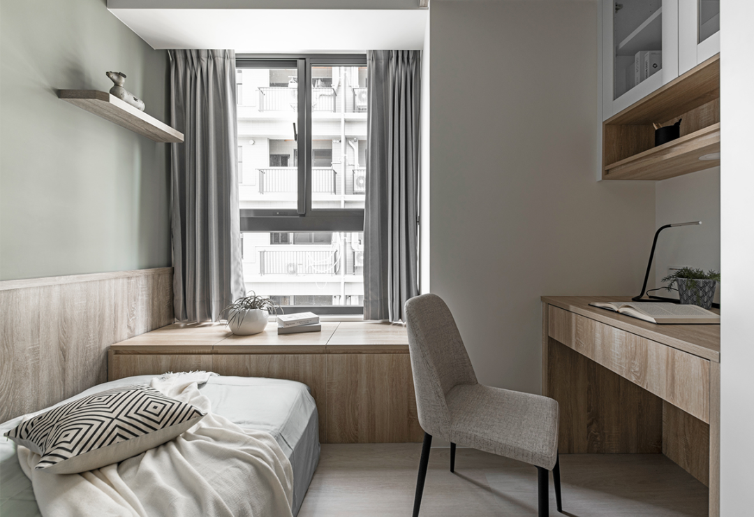 窗边推开可收纳卧榻,构成一幅口字框景,透过聚焦手法,将视觉重心转移至窗外,借此放大空间感。