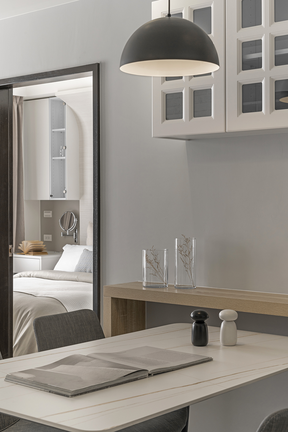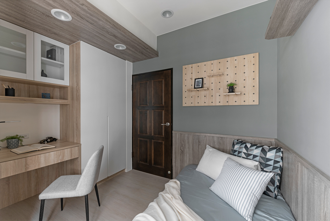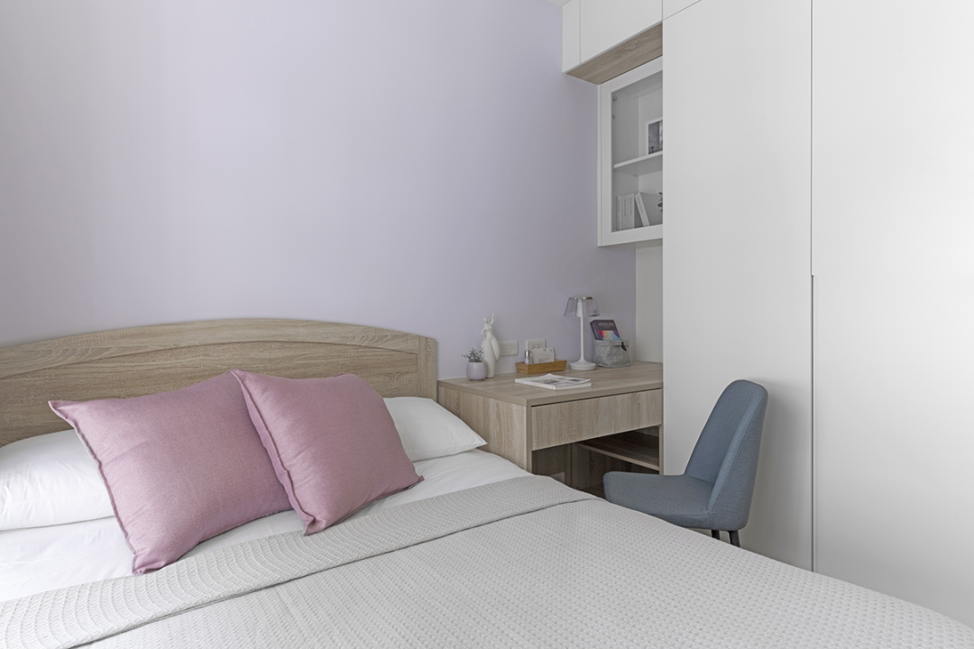 同时考虑房间基本功能需求,适度留白、精细设计定制柜,局部挪借空间面积 ,拓出衣柜和书桌配置。