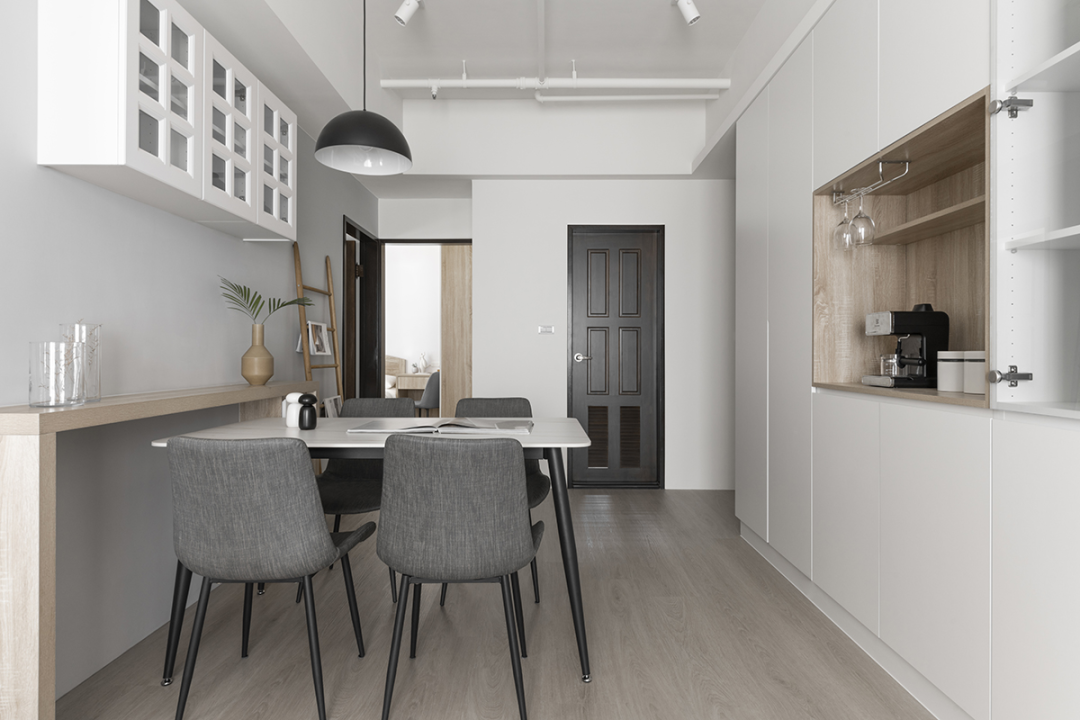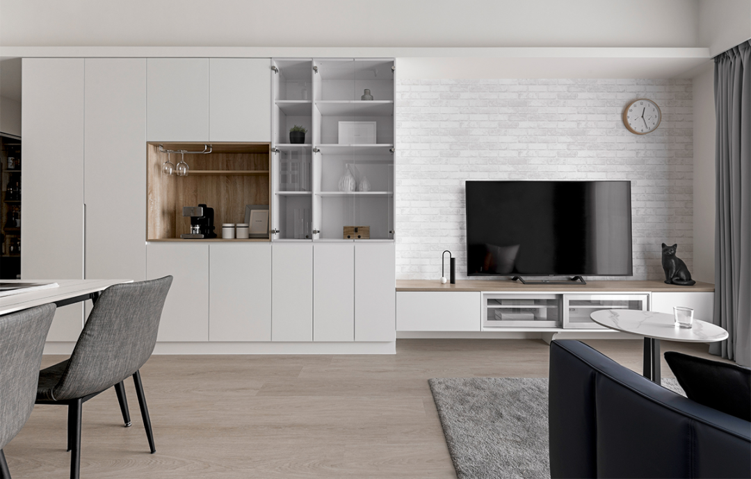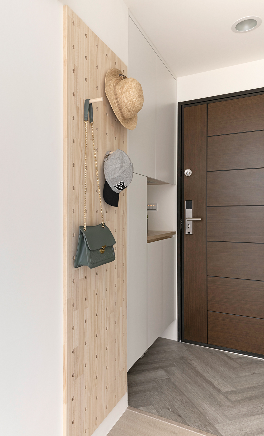 推开家门,人字拼地面划开落尘区,并以柜体收入全家人鞋履、钥匙、帽子和雨伞,使这座城市的粉尘、雨水皆止步于此;洞洞板不仅具备吊挂衣帽用途,也点缀白墙。