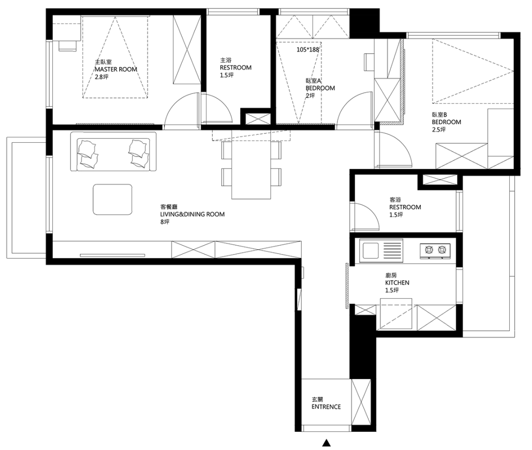 今天分享的案例位于台北桃园,室内面积94㎡(28坪),三室两厅一厨两卫,居住着一家四口。