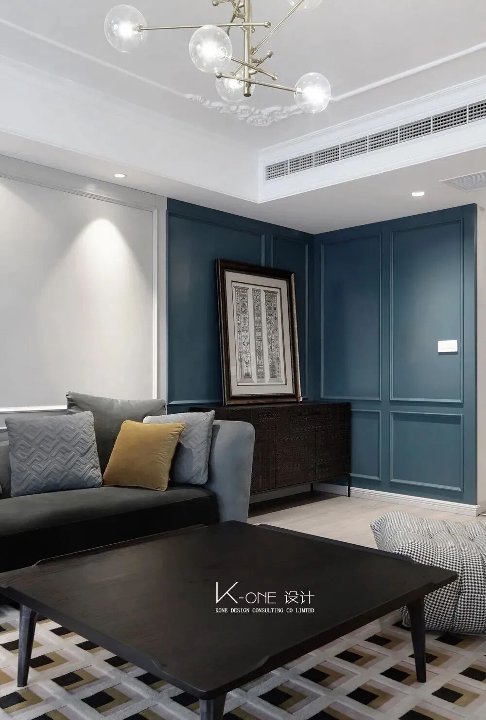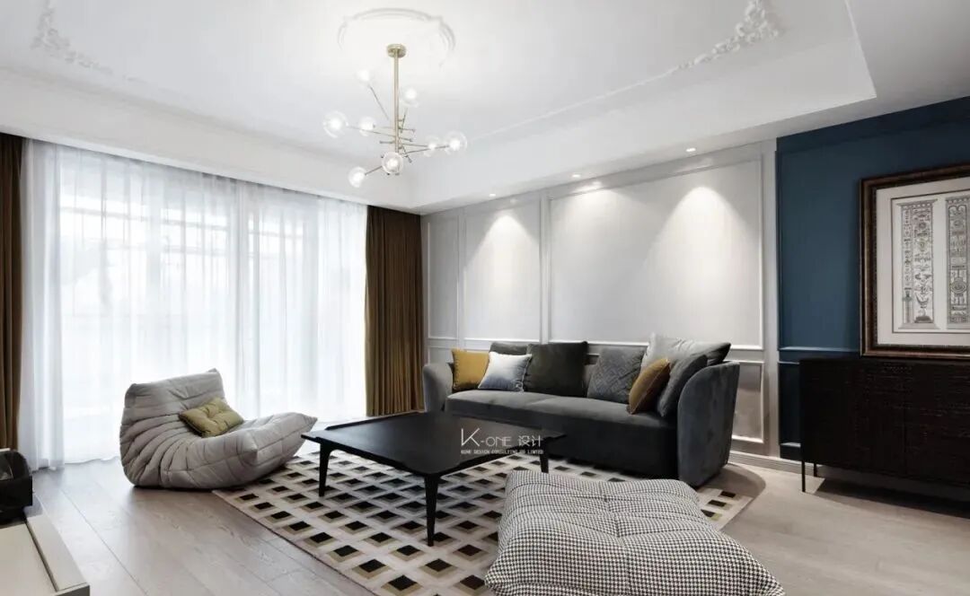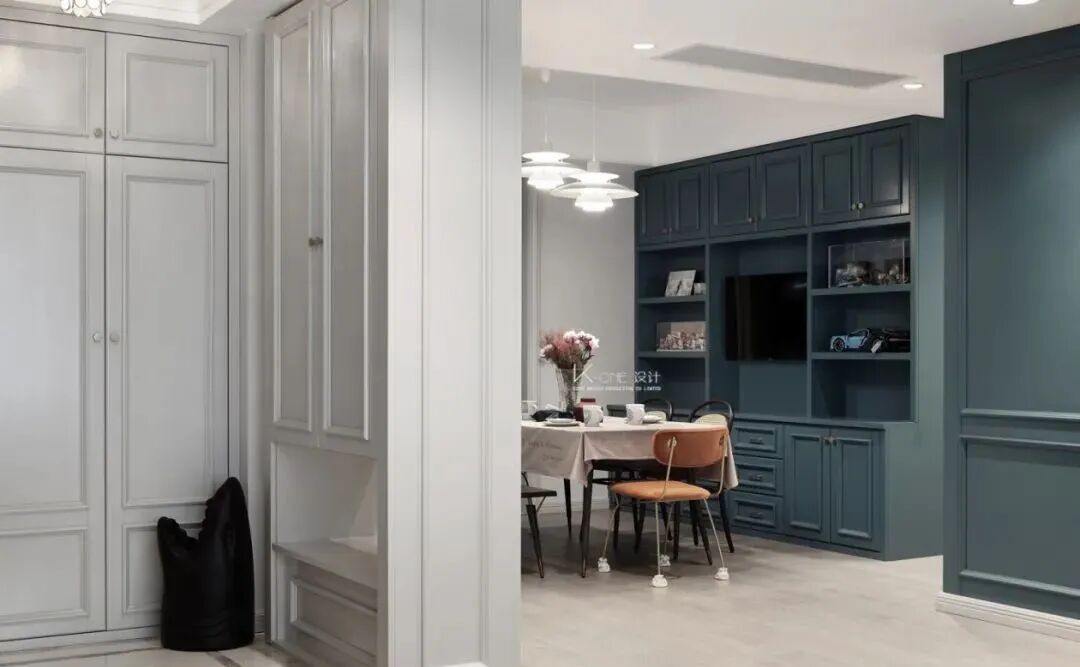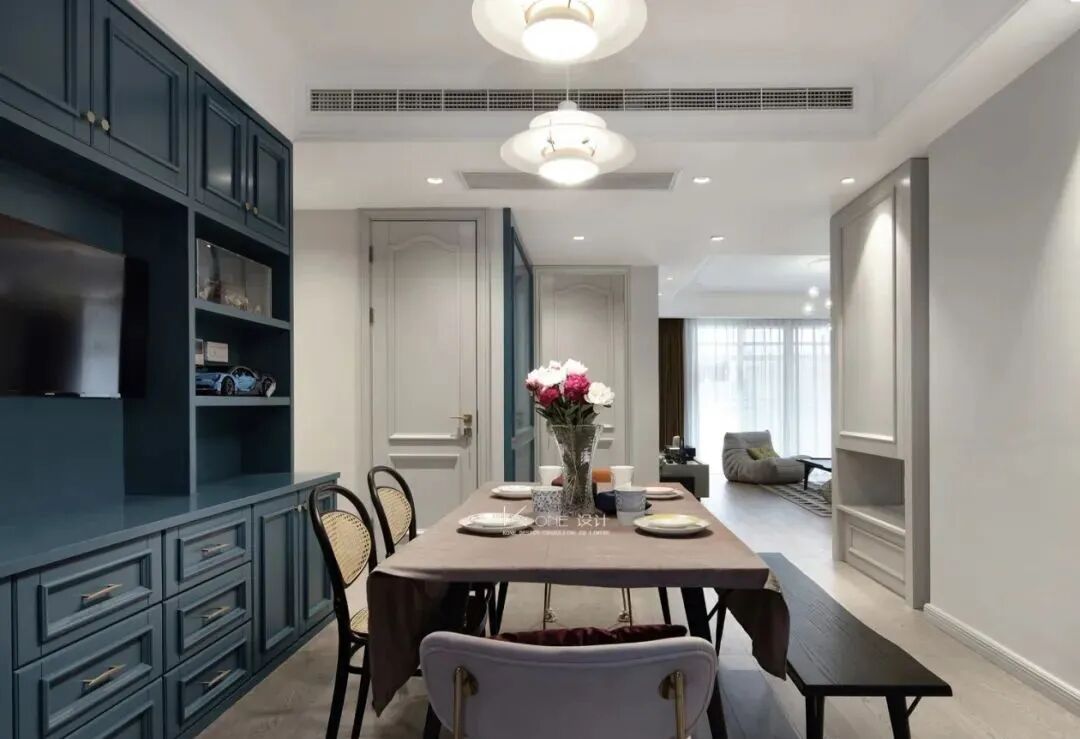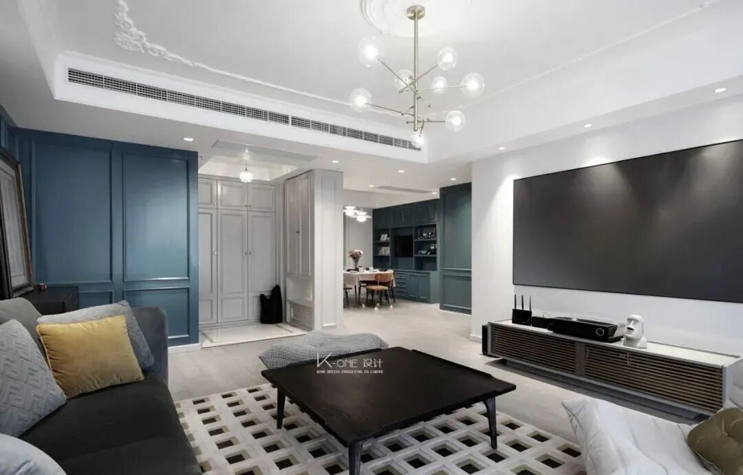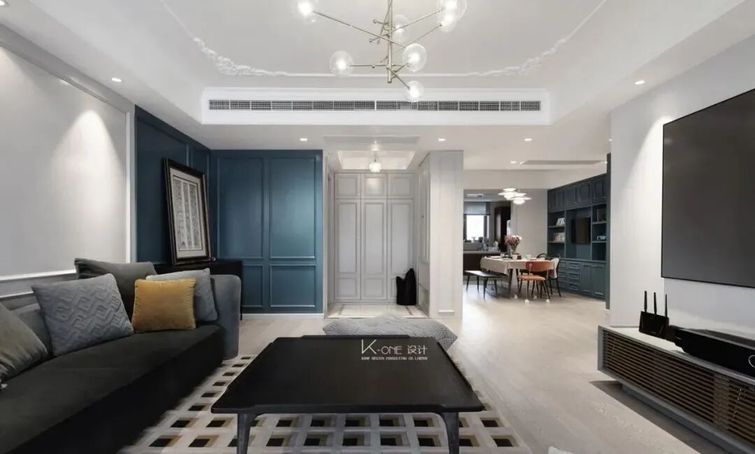 装修效果图:早上好,今天一起来欣赏一组171平简约美式风格新房装修案例。孔雀蓝在家居配色中,一直是优雅高级的存在。搭配点缀在美式风格中,刚好贴合,一起往下看看吧!